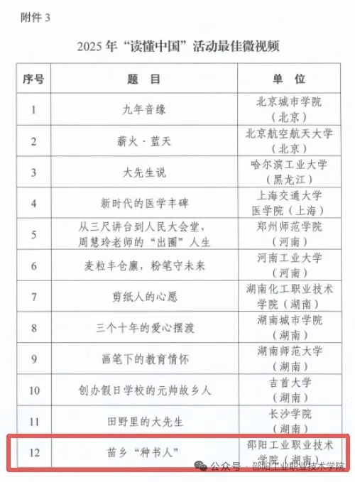 近日,教育部关心下一代工作委员会公布2025年“读懂中国”活动入选作品名单。邵阳工业职院首次参与此项全国性活动,成功斩获多项荣誉,选送的微视频作品《苗乡“种书人”》荣获最佳微视频奖项,邵阳工业职院获评“表扬单位”。