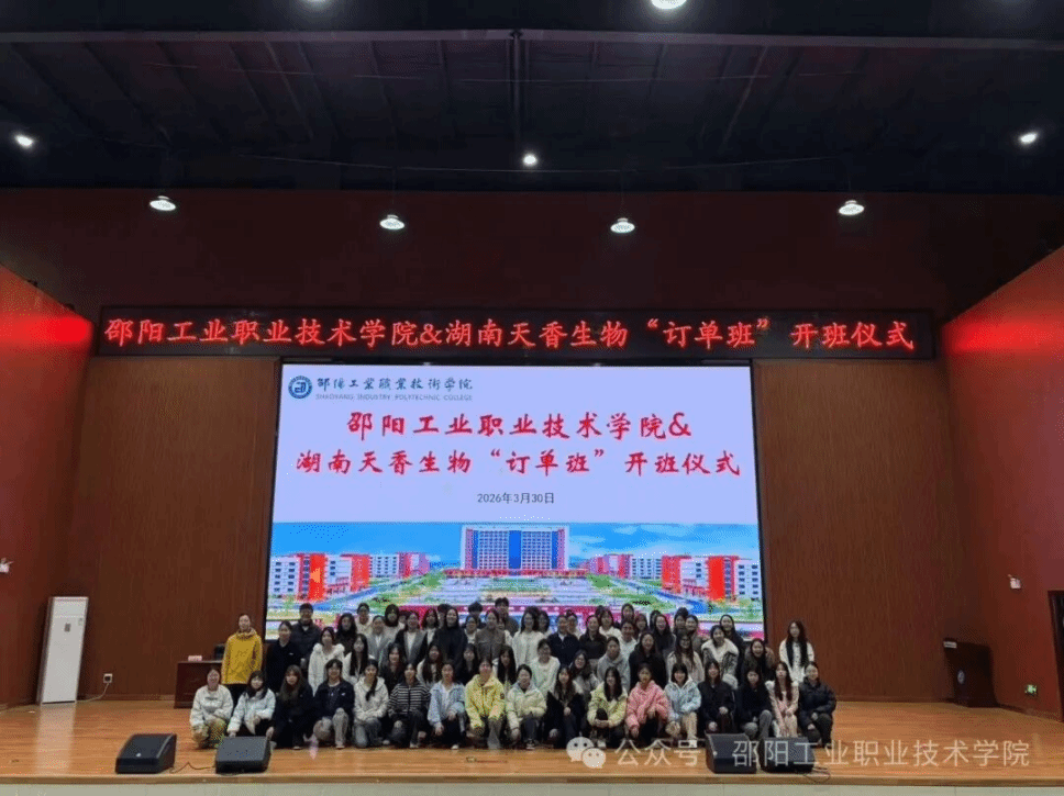 (通讯员:刘其洁 曾琪)3月30日,邵阳工业职业技术学院智慧康养学院与湖南省天香生物科技有限公司共建的“天香生物订单班”正式开班。仪式刚结束,校企双方便将“开班第一课”从会场直接搬进了生产车间和实践课堂,以“入学即入岗、学习即实战”的鲜明导向,为产教融合写下生动注脚。
