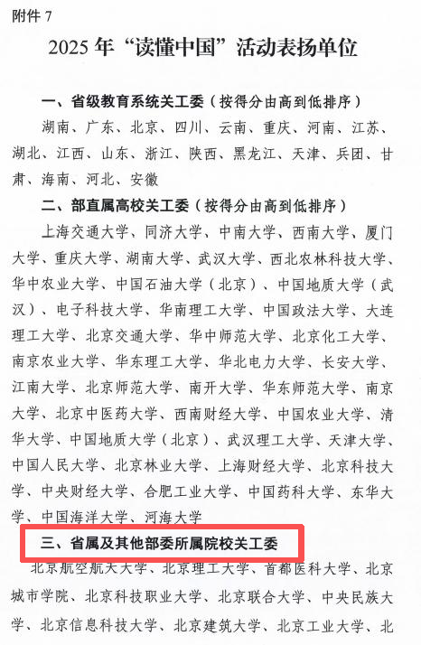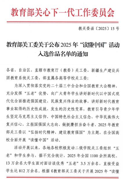 2025年,教育部关工委以“弘扬时代精神,建设教育强国”为主题,组织全国高校开展“读懂中国”活动。自活动启动以来,邵阳工业职院关工委在党委坚强领导与悉心关怀下,主动谋篇布局,充分发挥本地“五老”资源优势,组织学院青年学生深入参与,通过开展校内作品征集、评比推荐等形式,推动关心下一代工作提质升级、增效赋能。