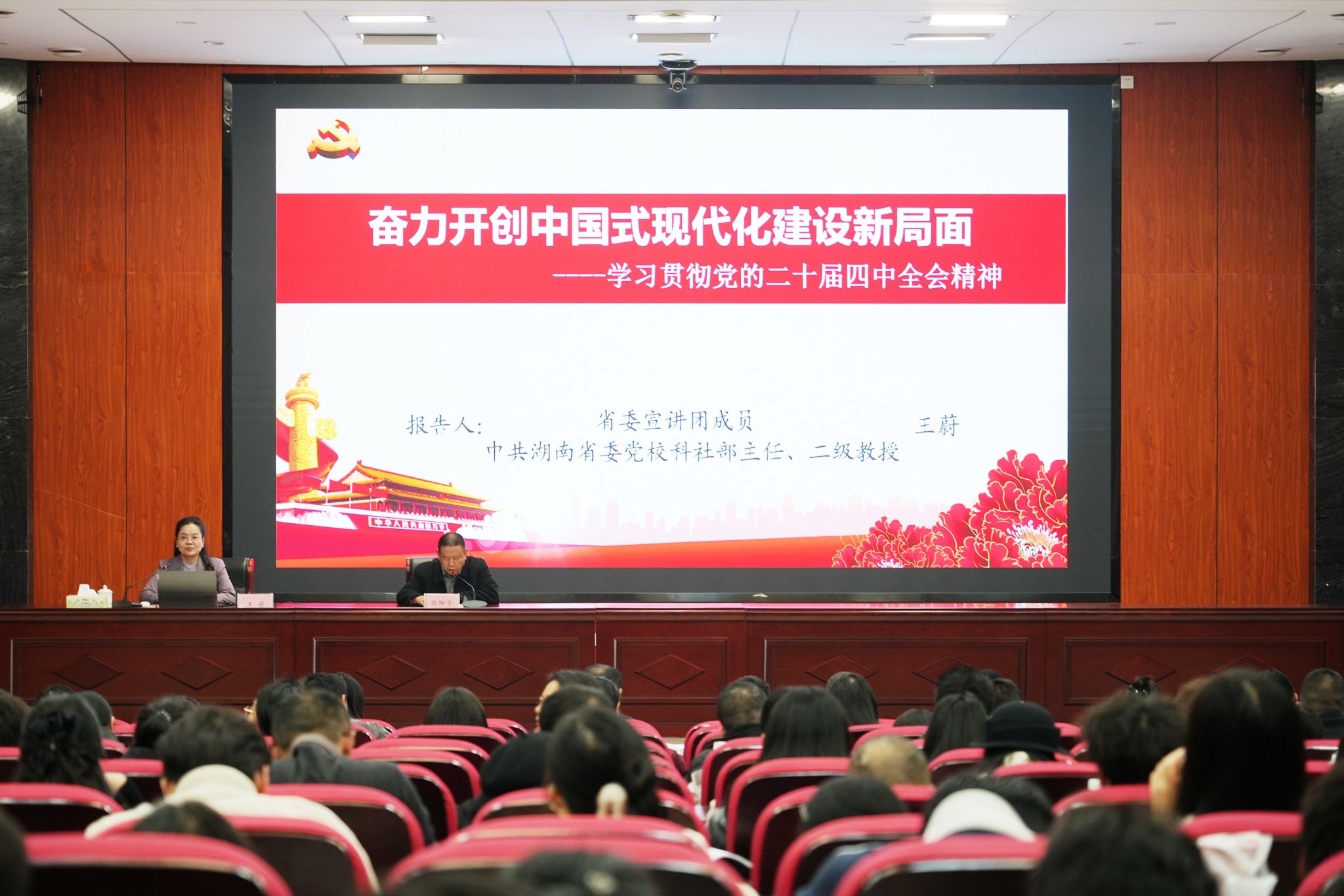 会上,王蔚教授以《奋力开创中国式现代化建设新局面——学习贯彻党的二十届四中全会精神》为题,从深刻认识党的二十届四中全会的重大意义、准确把握十五五时期经济社会发展的重要地位、深刻领会十五五时期经济社会发展的指导方针和主要目标、全面理解十五五时期经济社会发展的战略任务和重大举措、全力以赴抓好党的二十届四中全会精神的贯彻落实等五个方面,对党的二十届四中全会精神进行全面宣讲和系统阐述,对十五五时期经济社会发展规划建议进行了深入解读。