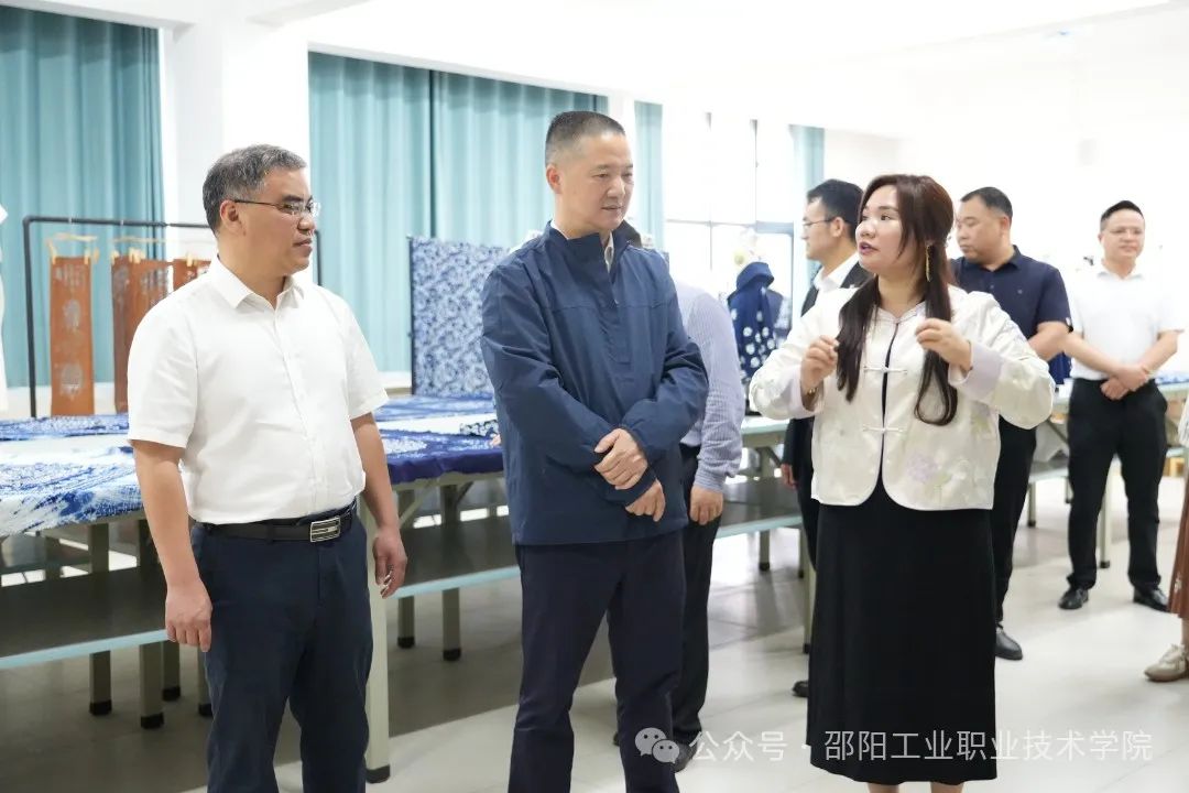 黄铁华一行走访察看了我校智能制造学院和数字设计学院,详细了解了我校蓝印花布实训室、新能源汽车实训室、大学生就业创业孵化基地的建设发展情况。