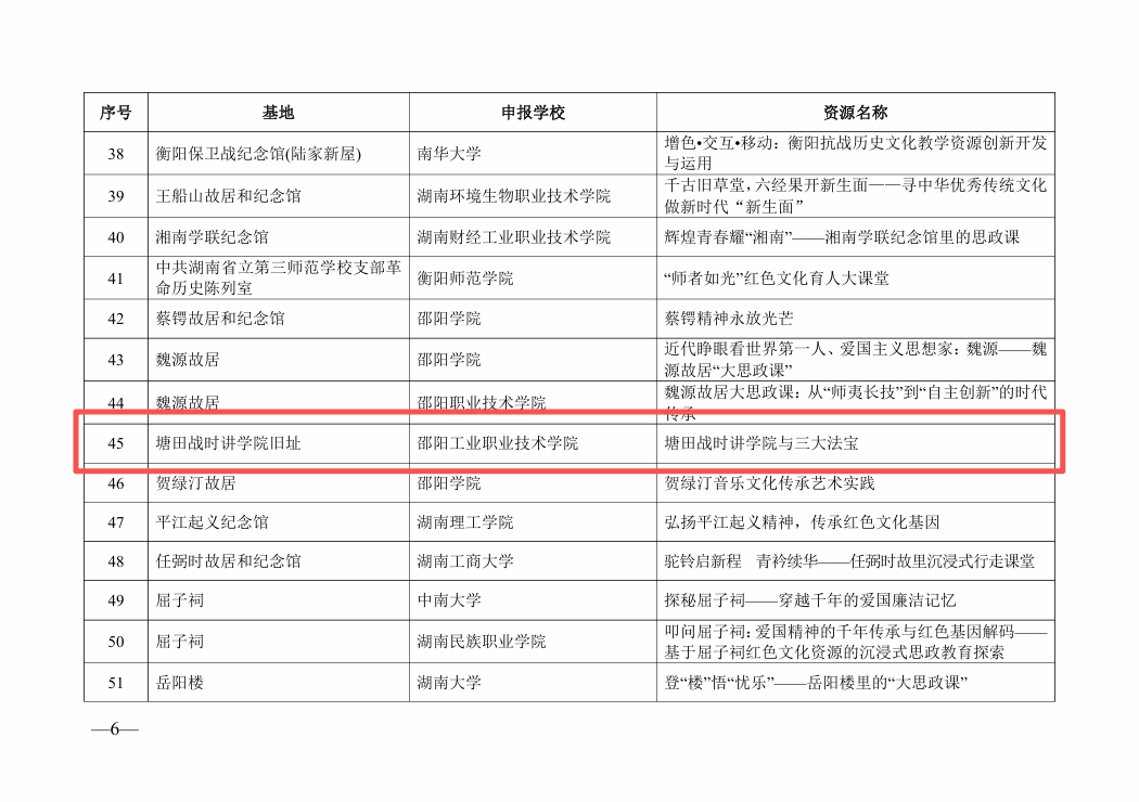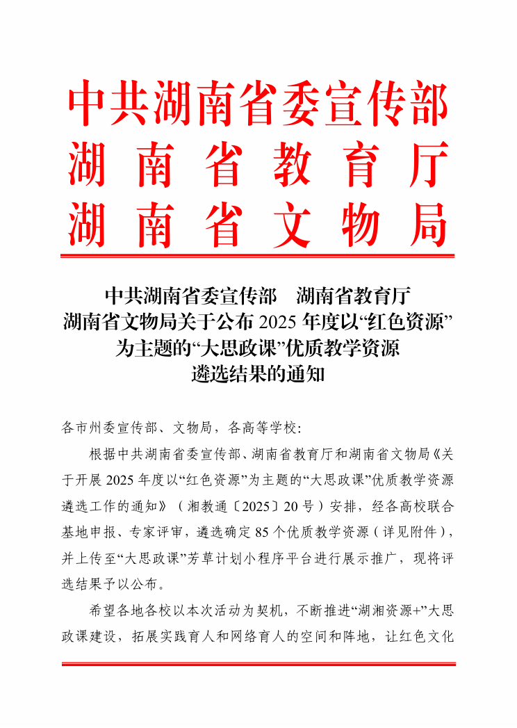 (通讯员:莫洛璋)近日,中共湖南省委宣传部、湖南省教育厅、湖南省文物局联合发布了《关于公布2025年度以“红色资源”为主题的“大思政课”优质教学资源遴选结果的通知》。由我校与塘田战时讲学院旧址纪念馆联合申报的“大思政课”实践教学资源——《塘田战时讲学院与三大法宝》成功入选省级优质资源库,标志着我校在思政课改革创新与实践育人融合方面取得了又一重要突破。