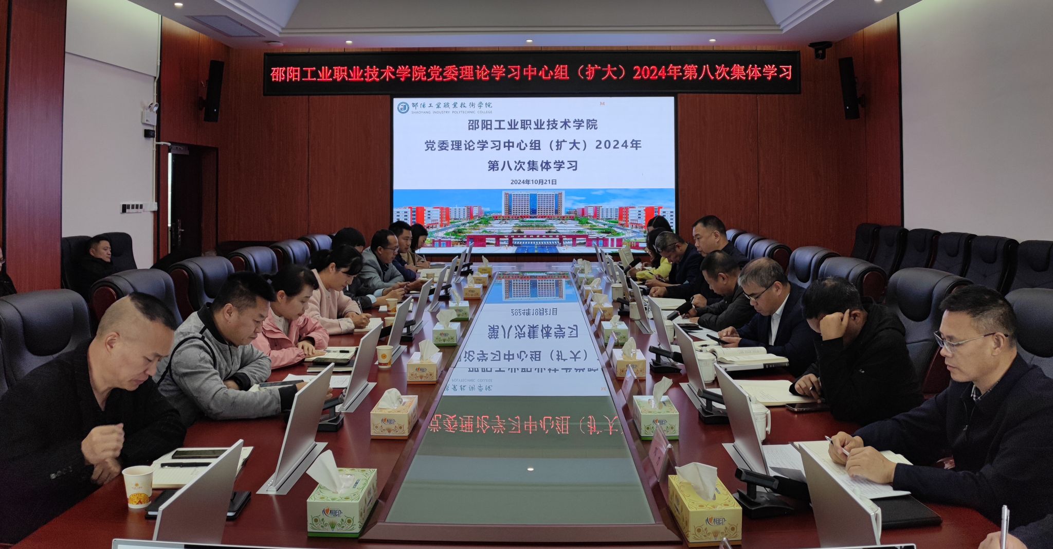 (宣传统战部 粟凡)10月21日上午,学院在综合楼六楼会议室召开党委理论学习中心组(扩大)2024年第八次集体学习会议。深入学习贯彻习近平总书记关于教育的重要论述,特别是其中关于思想政治教育的重要指示精神,更加坚定用习近平新时代中国特色社会主义思想武装头脑、指导实践、推动工作。