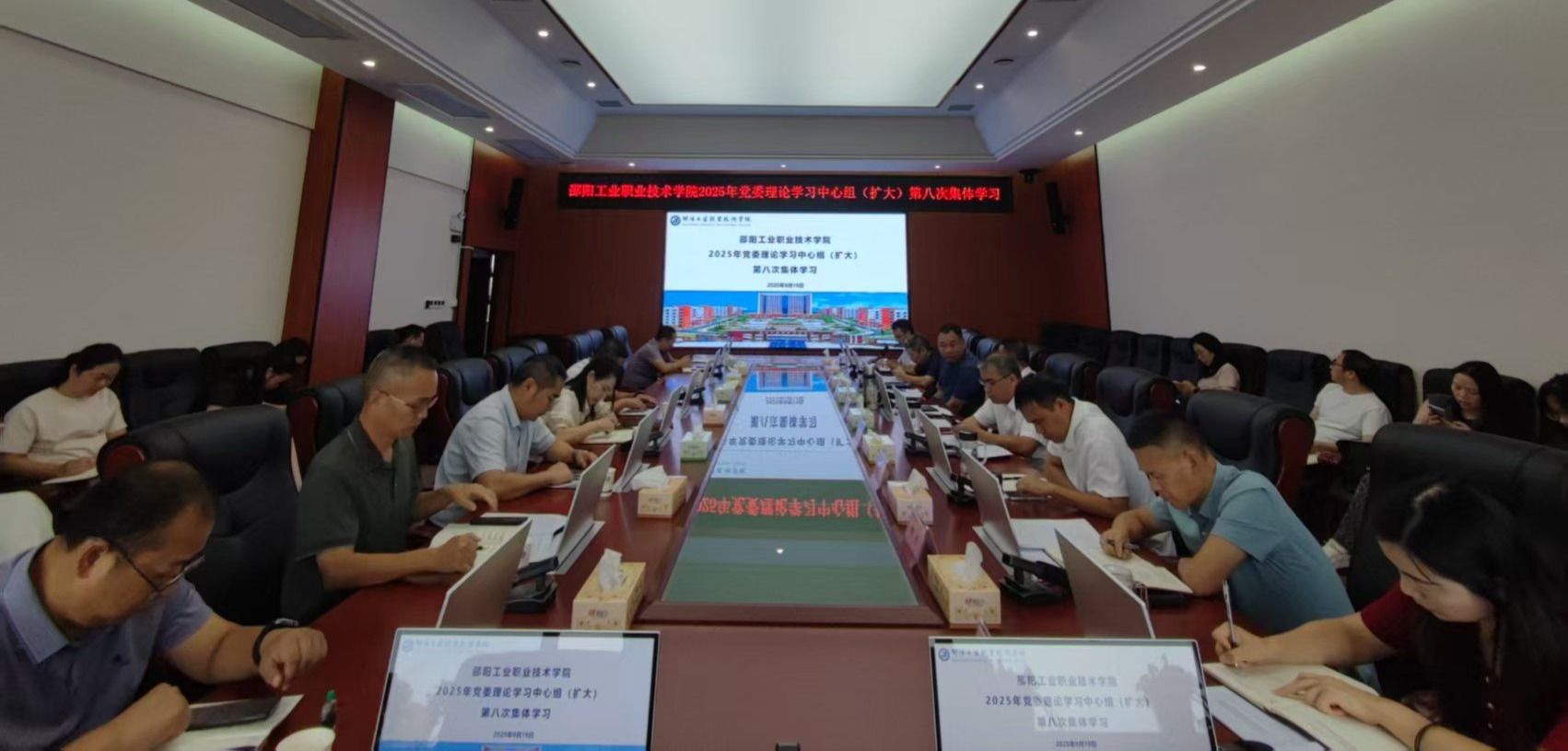 9月19日,学院2025年党委理论学习中心组(扩大)第八次集体学习会议在综合办公楼6楼会议室举行。本次会议旨在深入学习习近平总书记关于做好新时代党的统一战线工作、加强和改进民族工作的重要思想等内容,进一步贯彻落实《党委(党组)落实统战工作责任制规定》,完善构建大统战工作格局。学院党委书记欧阳学主持会议并讲话,党委副书记、院长李梦奇、党委副书记李鑫以及其余班子成员参加,各部门负责人列席参加。
