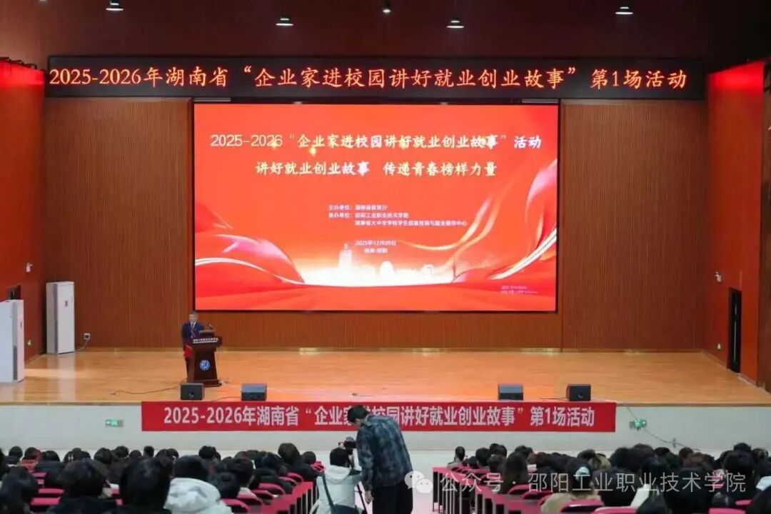 (通讯员:张耘搏)12月9日下午,2025-2026年湖南省“企业家进校园讲好就业创业故事”第1场活动在邵阳工业职业技术学院举行。本次活动由湖南省教育厅主办,邵阳工业职业技术学院、湖南省大中专学校学生信息咨询与就业指导中心共同承办,采用“线上直播+线下会场”模式向全省高校学子同步开放。学院党委书记欧阳学出席活动并致辞,党委委员、副院长贺珊刚主持活动,市教育局、市人力资源和社会保障局相关领导出席。欧阳学在致辞中指出,...