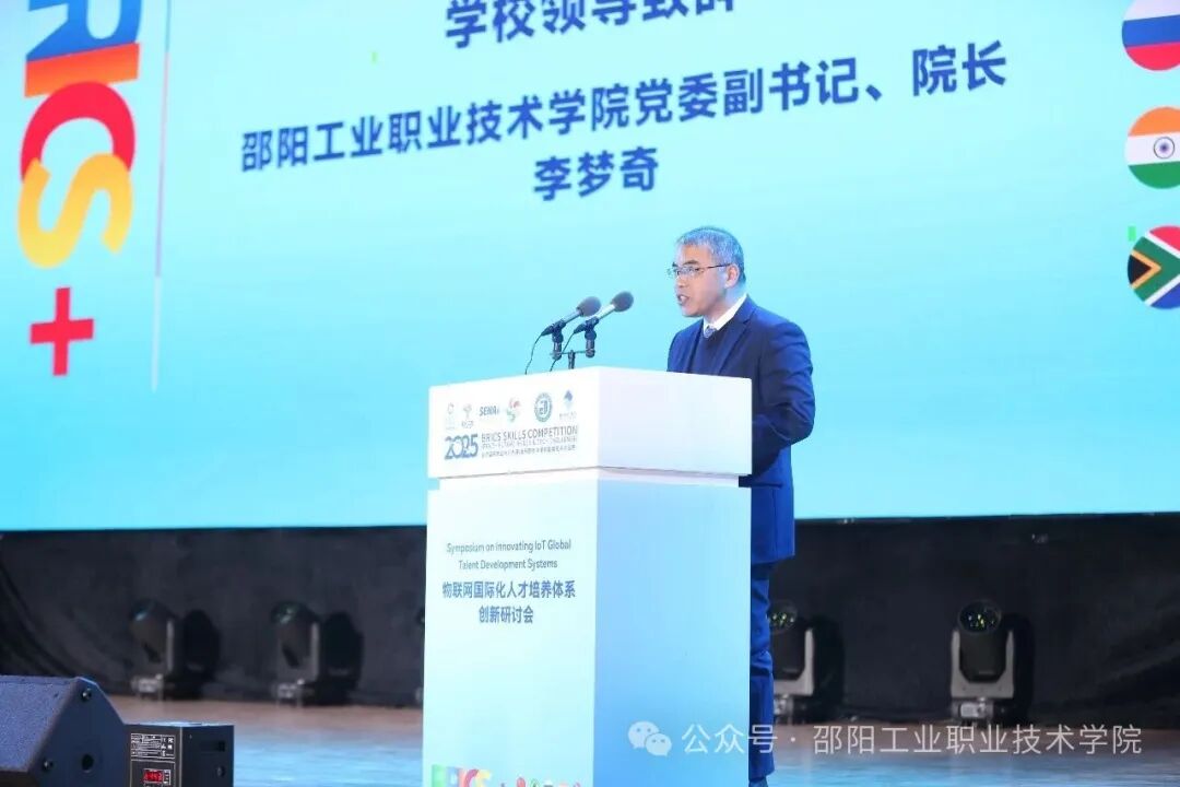 (通讯员:李进锋)12月12日至14日,2025年金砖国家职业技能大赛物联网赛项国际总决赛在邵阳工业职业技术学院成功举办。来自俄罗斯、哈萨克斯坦、孟加拉国、老挝等国家的17支国际队伍和国内65支队伍,共计160余名选手分别通过线上、线下的方式参加此次赛事。人力资源和社会保障部原职业能力建设司副司长、一级巡视员刘新昌,邵阳市副市长易洪海,市政协副主席、市科技局局长蒋志南,邵阳工业职业技术学院党委书记欧阳学,邵阳工业职业技术学院党委副书记、...