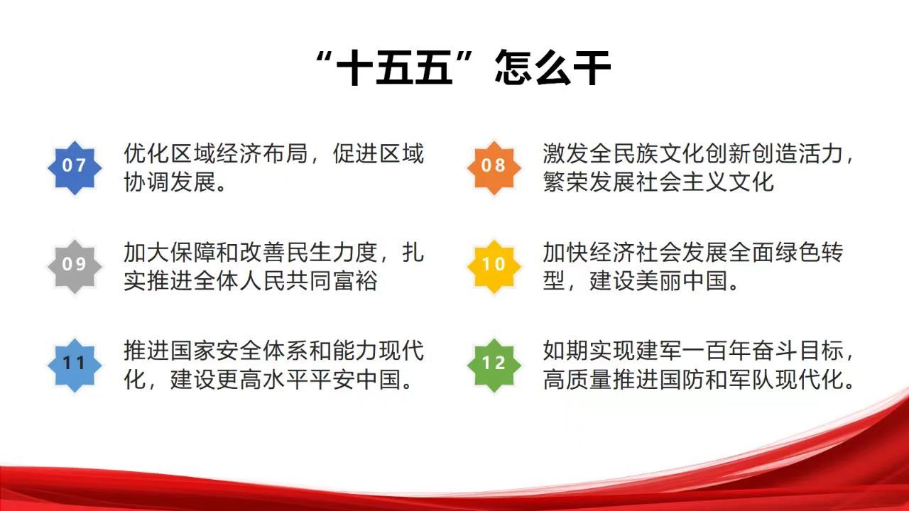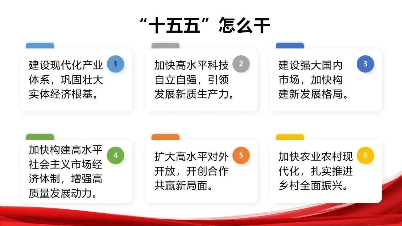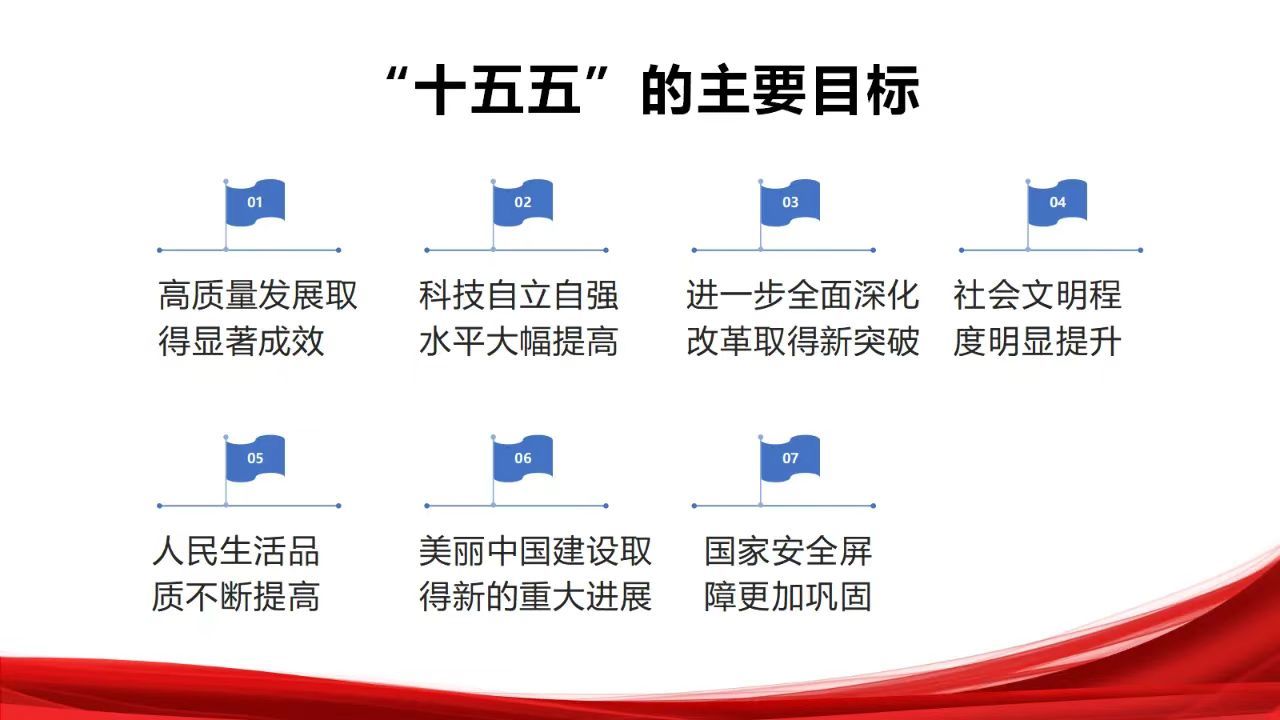 全会提出了“十五五”时期经济社会发展的主要目标:高质量发展取得显著成效,科技自立自强水平大幅提高,进一步全面深化改革取得新突破,社会文明程度明显提升,人民生活品质不断提高,美丽中国建设取得新的重大进展,国家安全屏障更加巩固。在此基础上再奋斗五年,到二〇三五年实现我国经济实力、科技实力、国防实力、综合国力和国际影响力大幅跃升,人均国内生产总值达到中等发达国家水平,人民生活更加幸福美好,基本实现社会主义现代化。