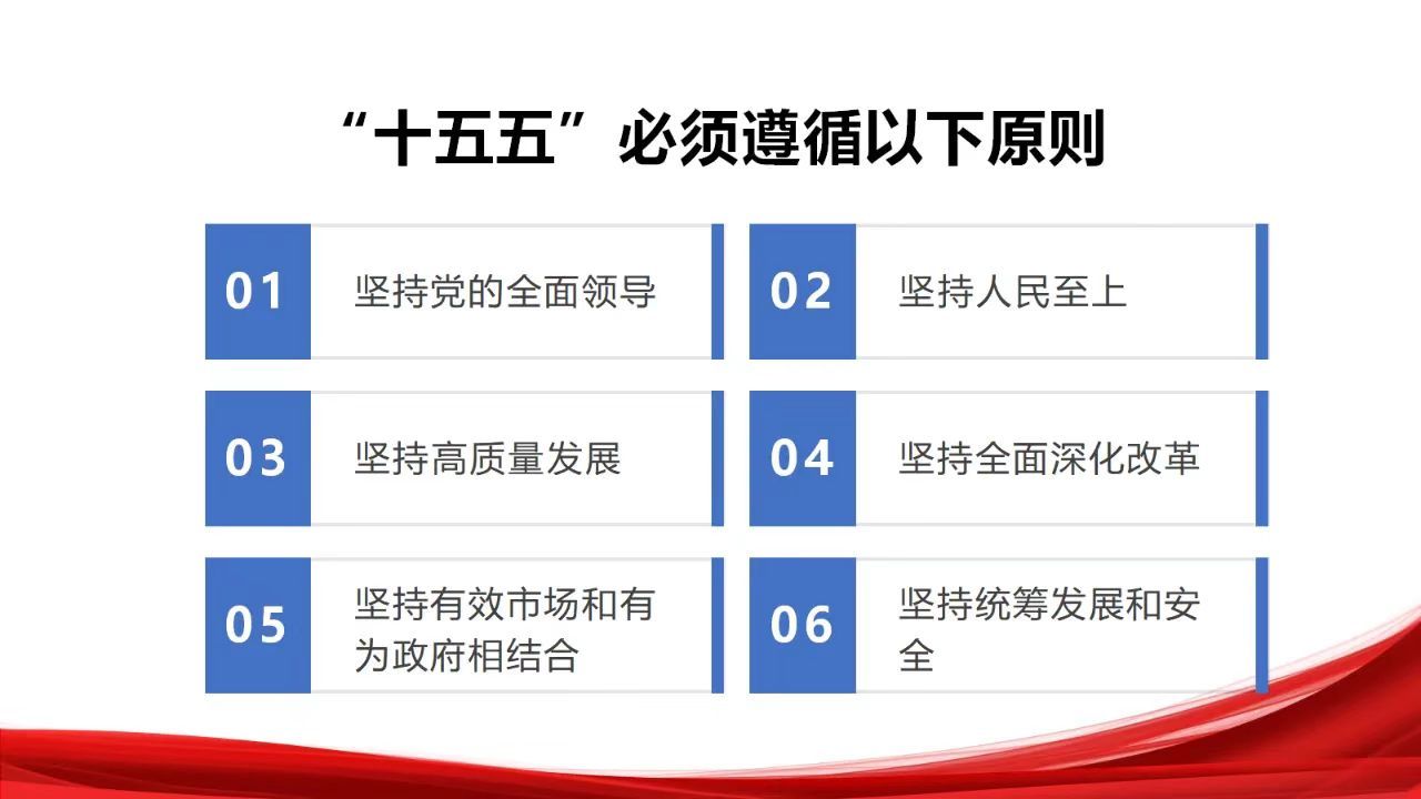 全会指出,“十五五”时期经济社会发展必须遵循以下原则,坚持党的全面领导,坚持人民至上,坚持高质量发展,坚持全面深化改革,坚持有效市场和有为政府相结合,坚持统筹发展和安全。