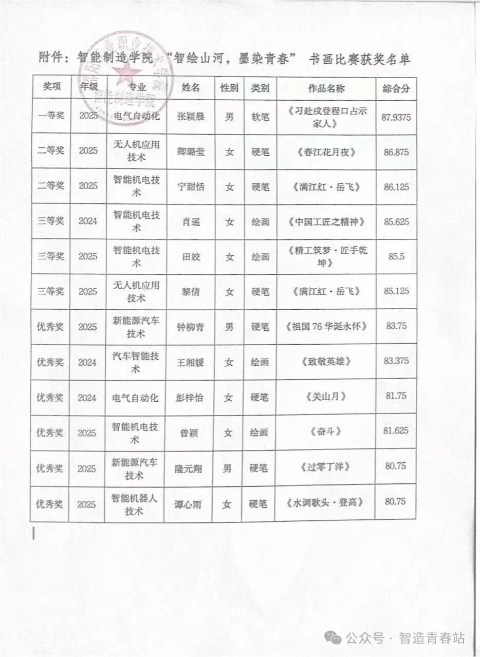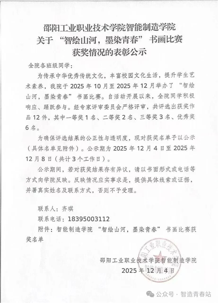 近日,邵阳工业职业技术学院智能制造学院“智绘山河,墨染青春”书画赛落幕。这场历时两月的赛事吸引全院学子参与,经专业评审,一批佳作脱颖而出。