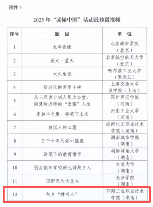(通讯员:陈嘉琪 袁余俊明)近日,教育部关心下一代工作委员会公布2025年“读懂中国”活动入选作品名单。邵阳工业职院首次参与此项全国性活动,成功斩获多项荣誉,选送的微视频作品《苗乡“种书人”》荣获最佳微视频奖项,邵阳工业职院获评“表扬单位”。