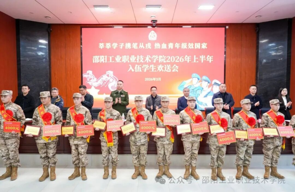 (通讯员:刘其洁 肖超 杨志远)3月13日下午,邵阳工业职业技术学院内国歌嘹亮,掌声如潮。2026年上半年大学生应征入伍欢送会在此举行。21名身着戎装、胸戴红花、肩披“光荣入伍”绶带的预定新兵精神抖擞,端坐会场中央,即将告别熟悉的校园,奔赴火热军营。学院党委书记欧阳学,党委副书记、院长李梦奇出席活动。