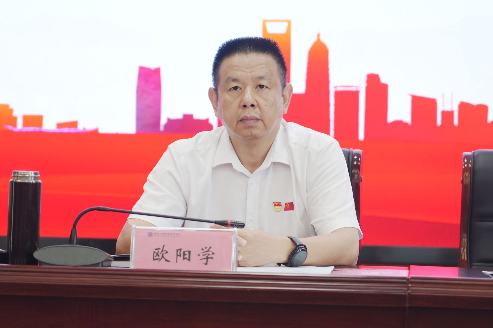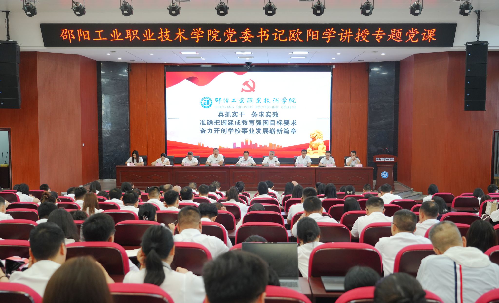 欧阳学以《真抓实干 务求实效 准确把握建成教育强国目标要求 奋力开创学校事业发展崭新篇章》为题讲授专题党课。他在党课中系统回顾中国共产党带领全国各族人民在革命、建设、改革时期创造的伟大成就,强调党的历史是“不懈奋斗的创业史、践行初心使命的为民史、勇于自我革命的斗争史”。围绕习近平总书记在全国教育大会上提出的教育强国建设 5 项重大任务,结合职业教育特色,从以思政育人筑牢立德根基、以产教融合强化支撑功能、以教育家精神锻造师资队伍三大维度展开深度解读。