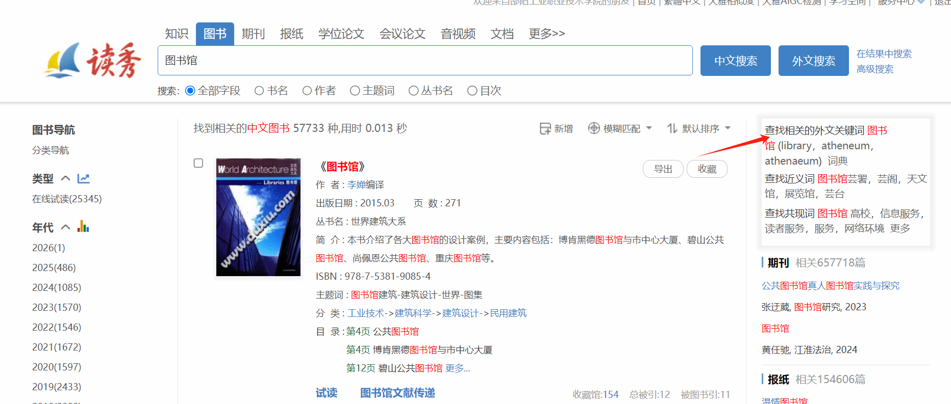 读秀针对用户输入的关键词,同时检索了所有的文献类型。一站式检索可以扩大搜索范围。在搜索结果很少的情况下,具有拓展搜索范围的功能。