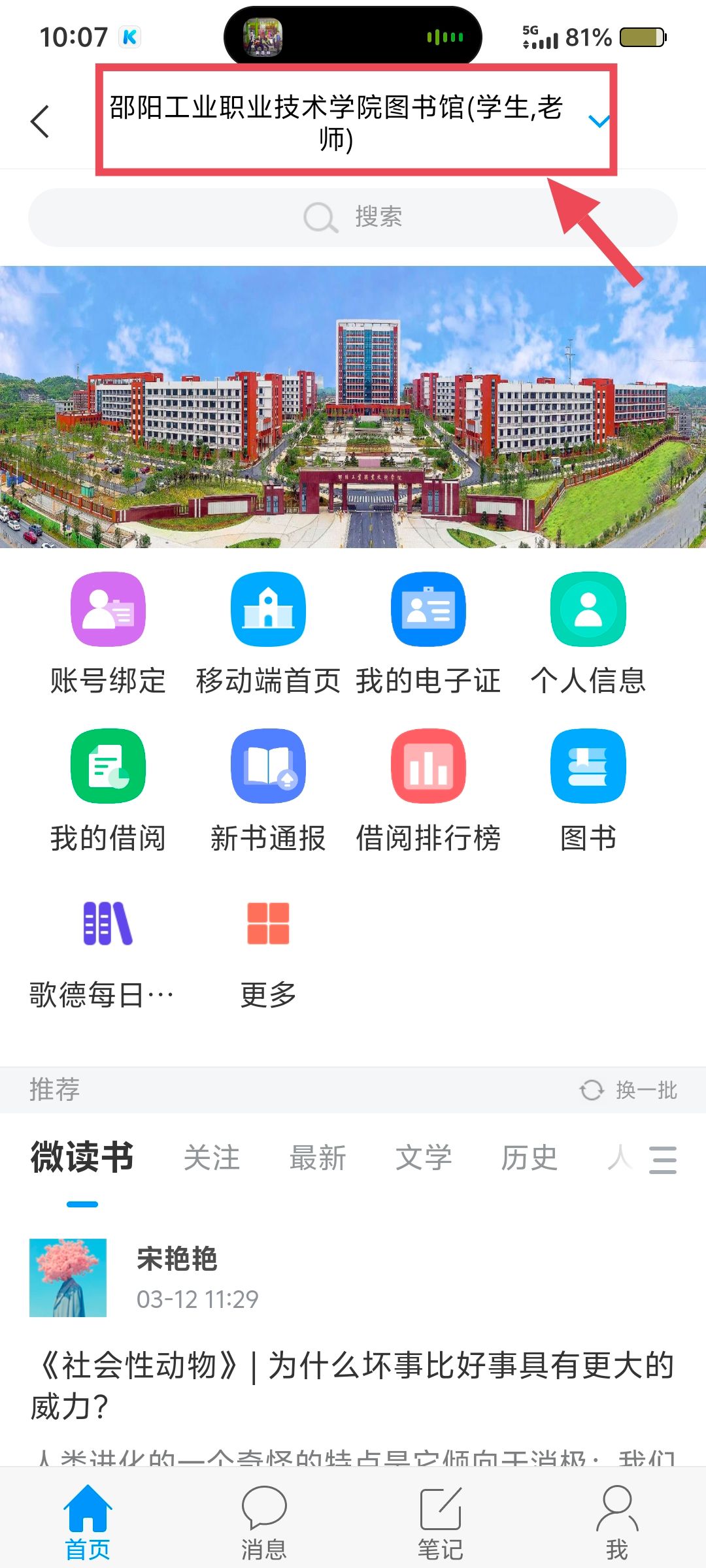 打开学习通(手机软件商店搜索学习通APP安装),进入学习通APP,选择邵阳工业职业技术学院图书馆,进入移动图书馆页面,点击移动端首页,进入馆藏资源统一检索界面。