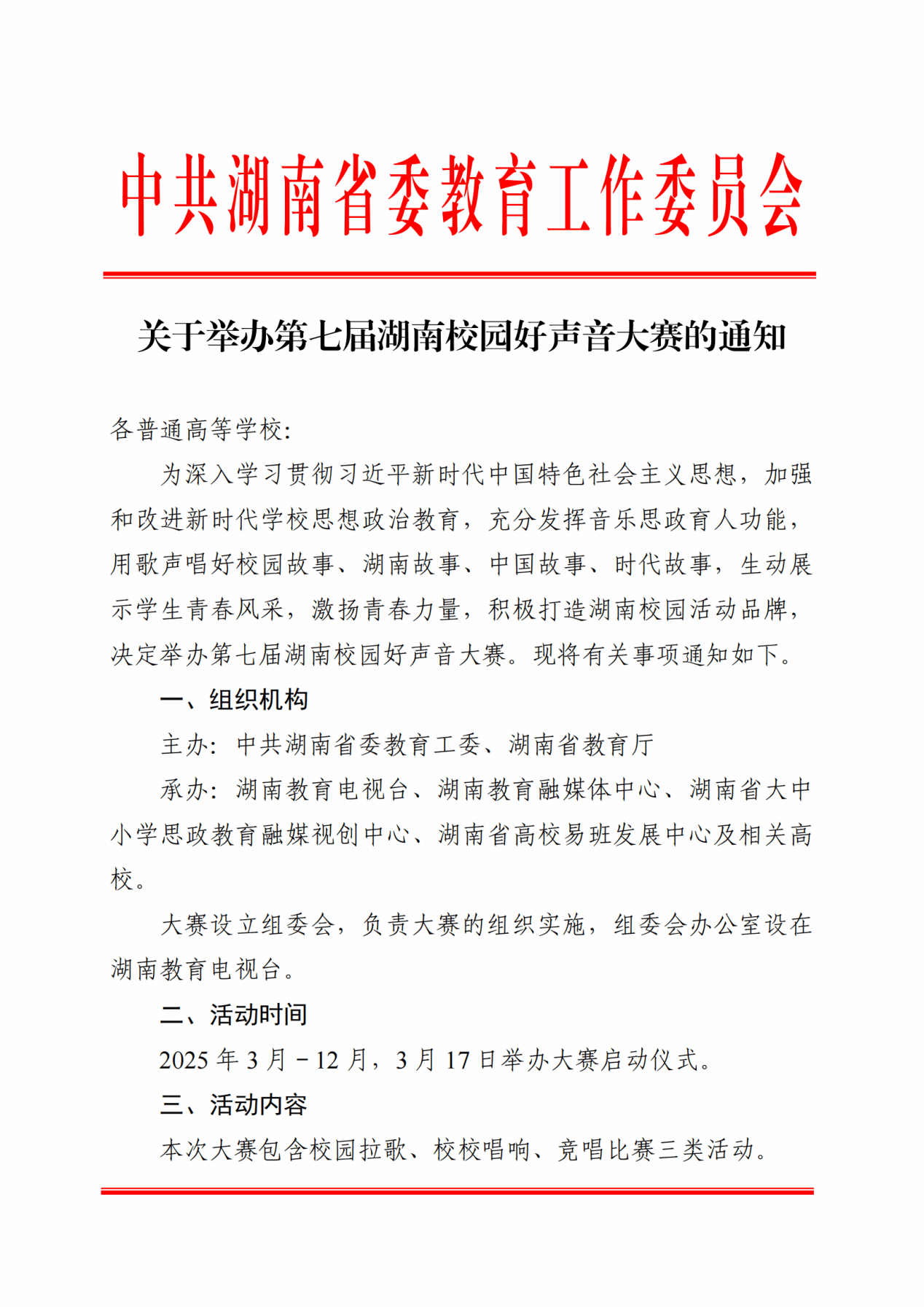 附件二 中共湖 南 省 委 教 育 工 作 委 员 会关于举办第七届湖南校园好声音大赛的通知