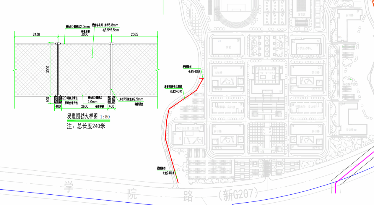 三、采购内容:为保障校园安全,加强学院管理需在学校教学区等建设勾丝护围栏共计约260米长(具体长度、工程量结算以实际验收为准)。项目内容·包含材料,运输、基础、安装、人工、矛盾协调处理及售后维护。详见附件清单。